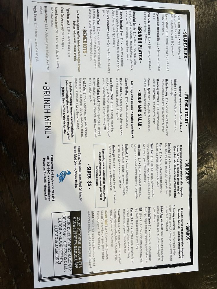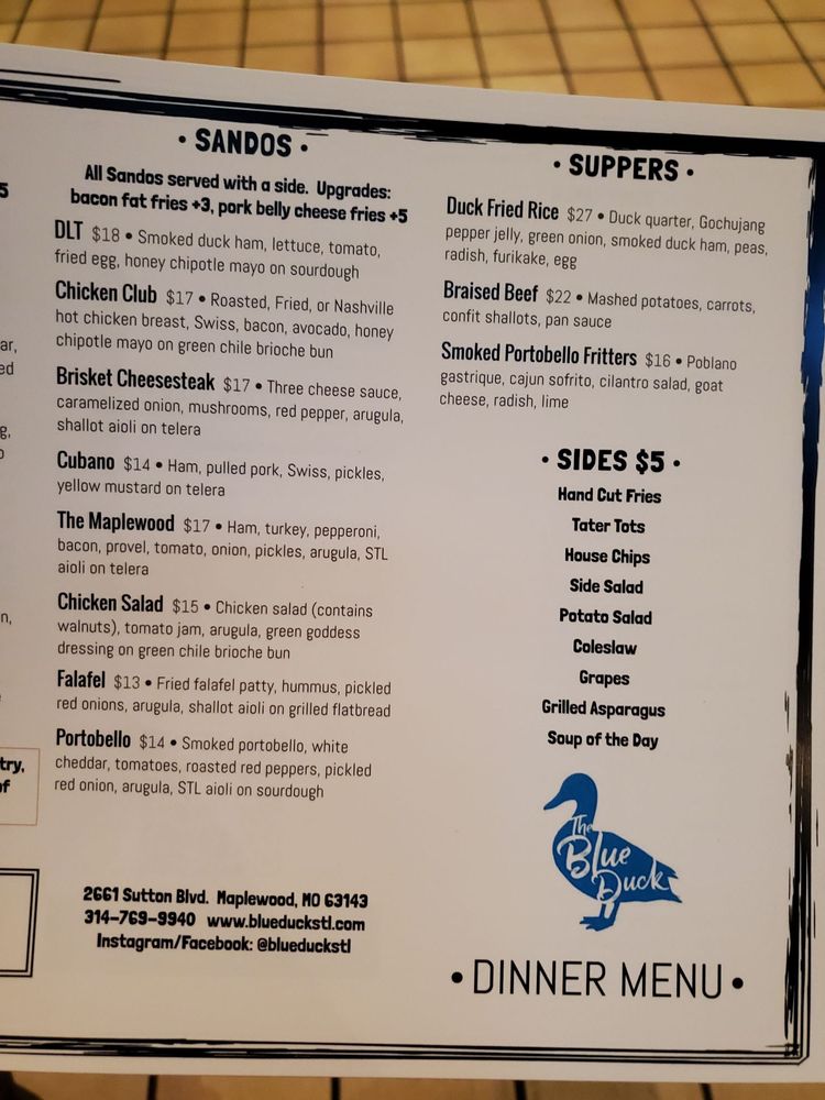 The Blue Duck in Maplewood, MO offers a diverse menu of comfort food, sandwiches, and burgers with vegan and vegetarian options. This trendy restaurant provides delivery, takeout, and reservations, making it convenient for any occasion. Their friendly staff, unique decor, and rooftop patio create a welcoming atmosphere. Highlights include the flavorful chicken club, hearty breakfast poutine, and delicious cocktails. While the menu is somewhat limited, customers rave about the quality of the dishes, especially the bread used in their sandwiches. Some may find the prices a bit high, but the overall experience and food quality make it worth the visit. Whether for brunch, lunch, dinner, or dessert, The Blue Duck is a must-try spot for delicious food and drinks.